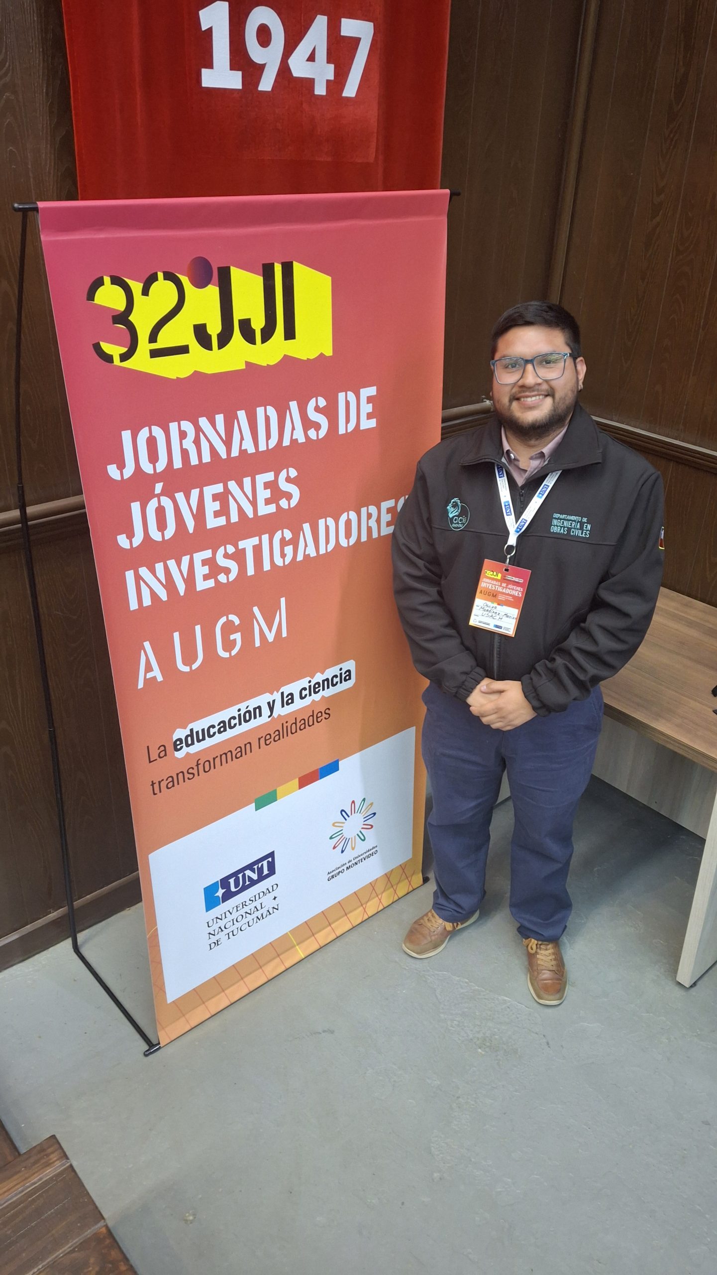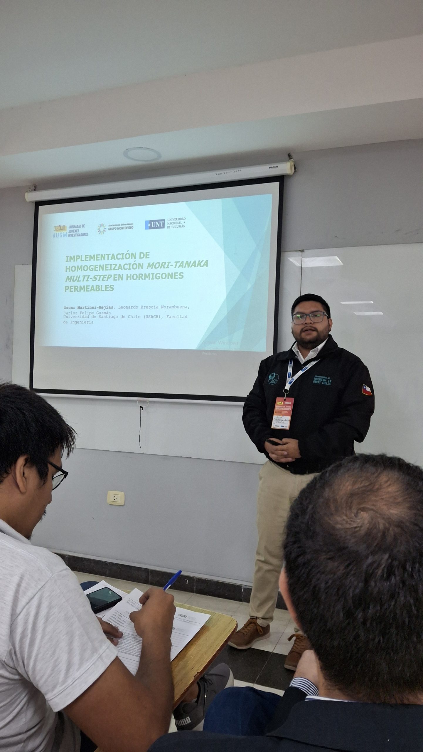 Óscar Martínez Mejías, estudiante de magíster, participó entre el 5 y el 7 de noviembre en las 32ª Jornadas de Jóvenes Investigadores (JJI) de la Asociación de Universidades Grupo Montevideo (AUGM), realizadas en la Universidad Nacional de Tucumán, en San Miguel de Tucumán, Argentina. El encuentro reunió a jóvenes científicos del Cono Sur con el objetivo de promover la colaboración académica y la difusión de investigaciones emergentes en diversas áreas del conocimiento. Martínez presentó el trabajo titulado “Implementación de Homogeneización Mori-Tanaka Multi-Step en Hormigones Permeables”, inserto en el eje de Ciencia e Ingeniería de Materiales. Su exposición abordó parte de los resultados de su investigación de tesis, centrada en la caracterización numérica del hormigón permeable, un material utilizado ampliamente para la gestión de aguas lluvias y superficiales.